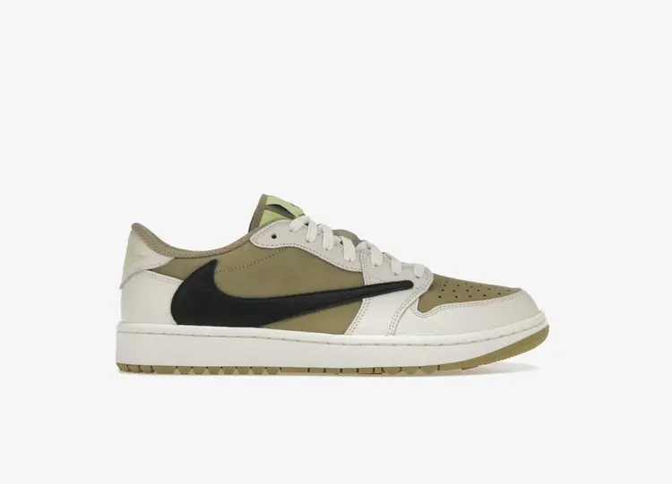 La Travis Scott x Air Jordan 1 Low Golf 'Neutral Olive' actualise la silhouette emblématique avec une construction repensée pour le terrain de golf. Un Swoosh en cuir noir inversé met en valeur le côté latéral de l'empeigne, avec une base en nubuck olive et des superpositions en cuir blanc cassé à l'avant-pied et au talon. Une étiquette Jordan Golf tissée se trouve sur la languette dans une teinte vert citron, assortie aux logos Cactus Jack et Jordan Wings qui ornent la languette arrière de la chaussure gauche et de la chaussure droite. Sous le pied, la semelle en caoutchouc présente un motif de traction intégré pour une meilleure adhérence. AIR JORDAN I LOW