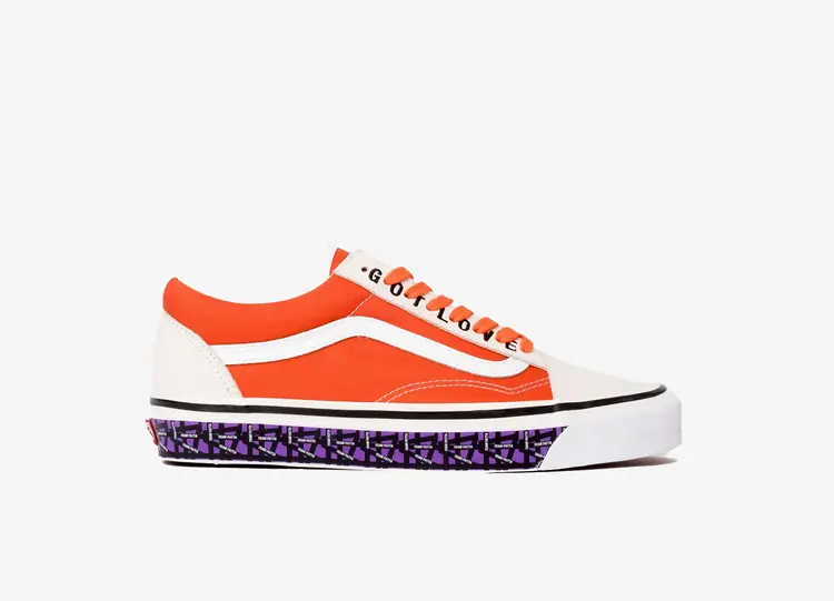 La Gallery Dept. x Vans OG Old Skool LX 'Good Luck' présente la première collaboration entre les deux marques du sud de la Californie. Des lacets jaunes - portant l'inscription "Good Luck !" dans un motif répétitif - fixent la tige en cuir blanc, accentuée par des bandes latérales rouges floues et couverte d'un texte noir et blanc inspiré des flyers de spectacles punk vintage. Des empiècements en daim noir renforcent la pointe et le talon, ce dernier portant l'inscription " Art That Kills " en lettres brodées rouges. La semelle intercalaire en caoutchouc blanc présente une finition pré-étirée, avec une bande de renard bleu vif et la marque Gallery Dept. VANS OLD SKOOL